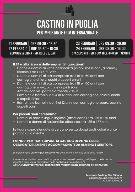 AttualitàRegione URGENTE. Casting in Puglia per importante film internazionale 19 Febbraio 2024 Redazione ILBE è alla ricerca di diverse figurazioni. Tutti i dettagli qui sotto.