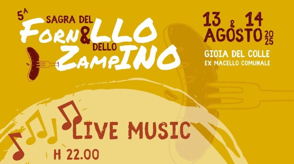 Il 13 e 14 agosto 2025 dalle ore 19:30, presso l’ex macello comunale di Gioia del Colle, cuore pulsante della città, si terrà la quinta edizione della Sagra del Fornello e dello Zampino!