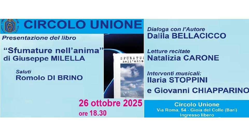 Domenica 26 alle ore 18.30 presso il Circolo Unione Giuseppe Milella presenterà “Sfumature nell’anima”, un’opera in cui” l’autore scava nel profondo di ognuno di noi, raggiungendo quei sentimenti inespressi che sono le fondamenta essenziali per la vita nel suo scorrer quotidiano, piccoli istanti apparentemente insignificanti, emozioni velate, inespresse, celate ma profondamente radicate in ognuno di noi…”, per dirla con le parole di Laura Efrikian che ne ha curato la postfazione.