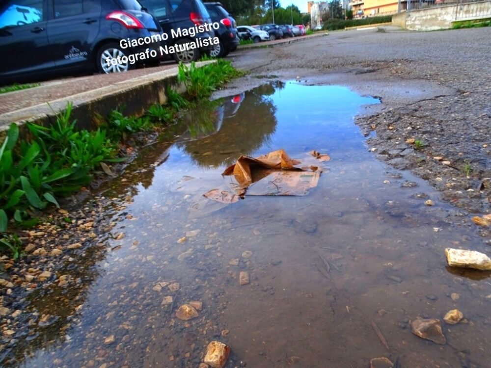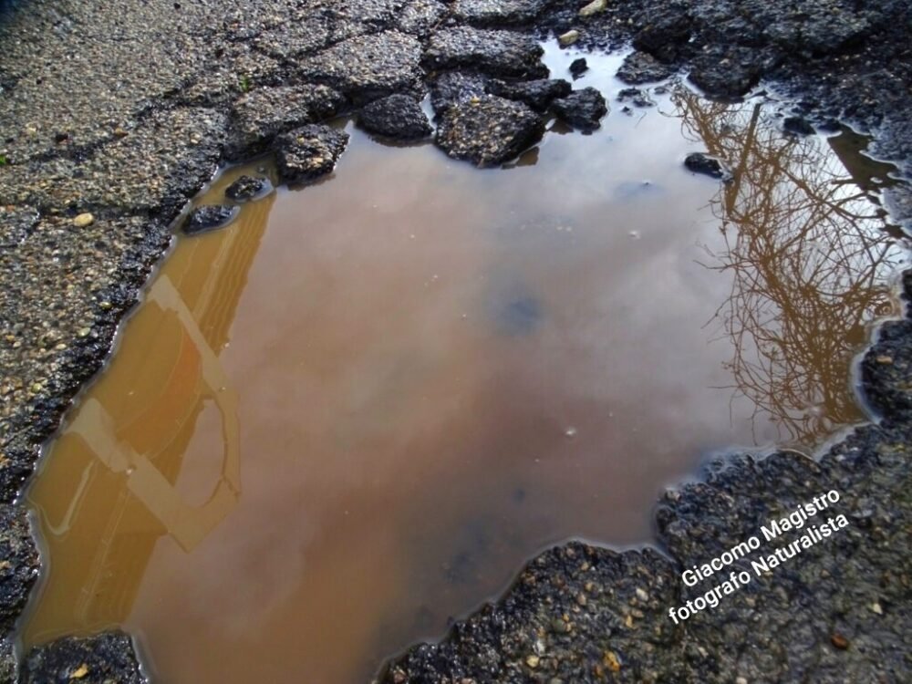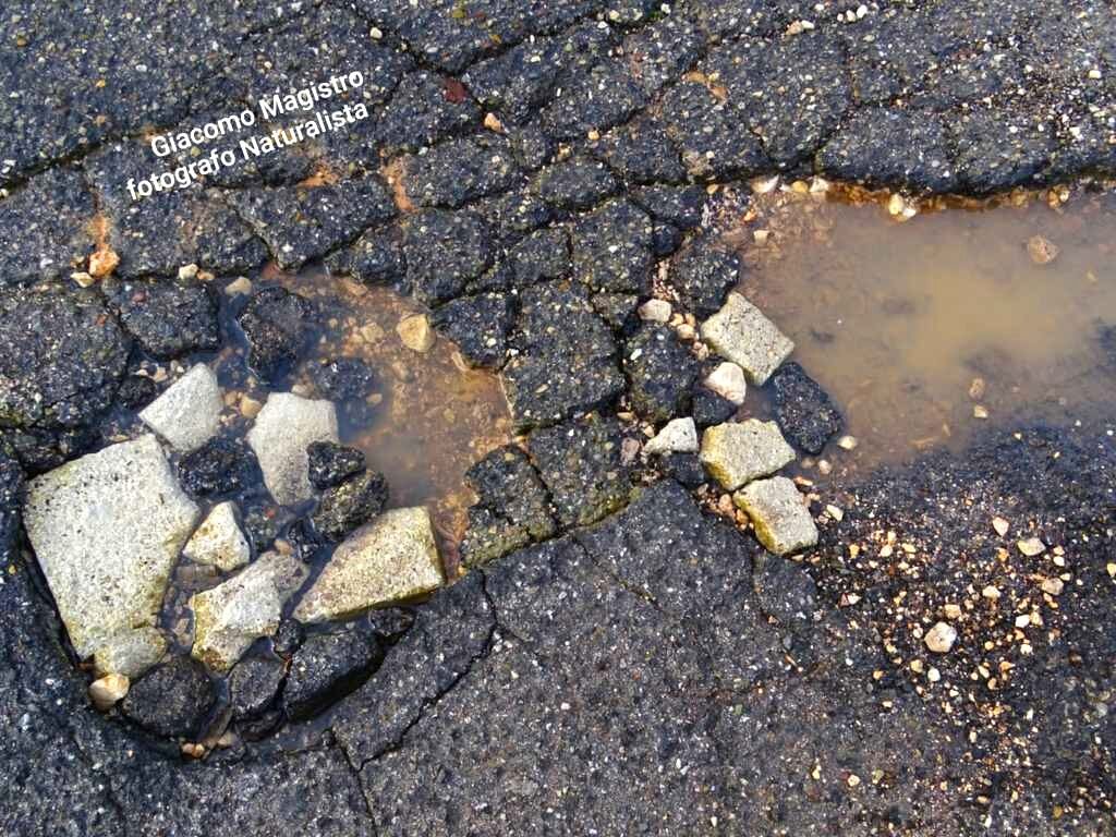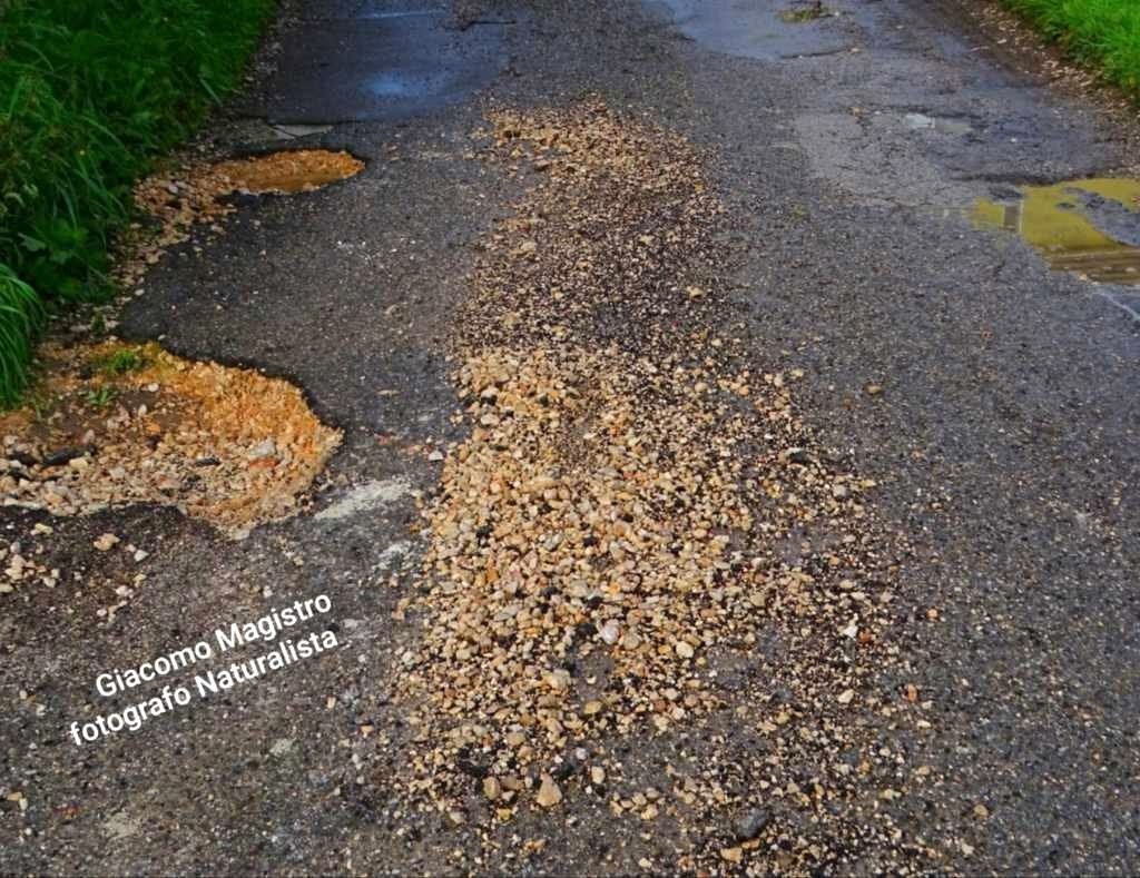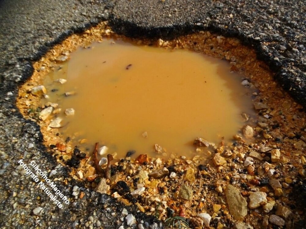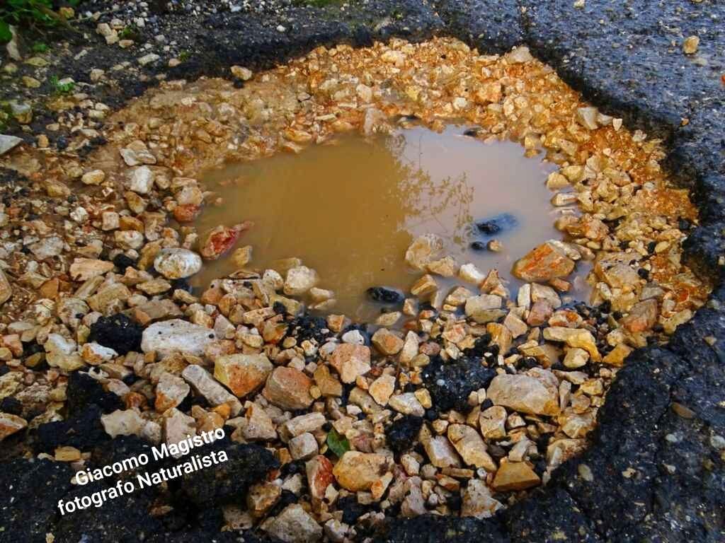 Le immagini catturate dal nostro amico/collaboratore Giacomo Magistro (attivista LIPU e fotografo naturalista) non lasciano spazio a interpretazioni: quelle che solcano l’asfalto cittadino non sono semplici buche, ma autentiche voragini. Si tratta di squarci profondi che, al primo accenno di pioggia, si trasformano in insidiosi laghetti di acqua stagnante, mimetizzando il pericolo per automobilisti e pedoni. Nonostante i ripetuti e sporadici interventi “tampone” – realizzati approssimativamente con ghiaia mista a catrame a freddo – il problema persiste e si aggrava. Con il passare del tempo e l’azione erosiva degli agenti atmosferici, queste ferite nel manto stradale continuano ad allargarsi e a sprofondare, moltiplicandosi su tutto il territorio cittadino, in modo esponenziale sotto lo sguardo rassegnato dei residenti.