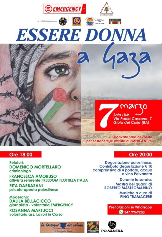 A ridosso della Giornata Internazionale della Donna, il gruppo EMERGENCY di Gioia del Colle invita la cittadinanza a un incontro “Essere Donna a Gaza” che va oltre la semplice cronaca: un viaggio profondo nel cuore della Palestina.