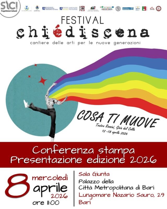 Domani, mercoledì 8 aprile 2026, alle ore 11:00, nella sala Giunta del Palazzo della Città Metropolitana di Bari, si svolgerà la conferenza stampa di presentazione della nona edizione del Festival “Chièdiscena”, cantiere delle arti per le nuove generazioni promosso e curato dall’associazione culturale Sic! ProgettAzioni Culturali.